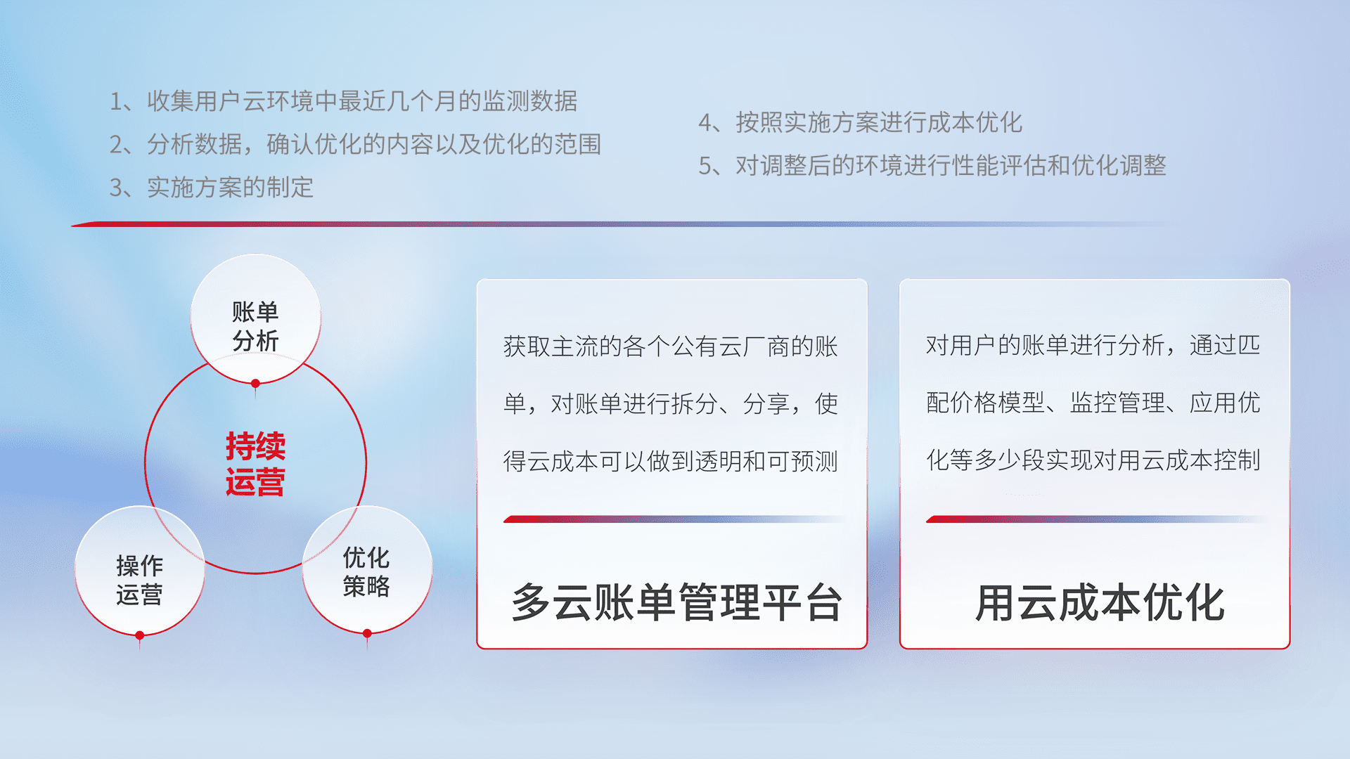 通过多云纳管,,以统一的资源数据模型把客户的云资源进行抽象和封装,,进而实现对多云资源的统一操作,,,保障云资源管理的可靠性、、稳定性与可用性。。。量身定制化运维内容,,,配置、、开发运维、、补丁管理、、、、备份、、、、监控、、认证和访问管理、、、、审计和日常巡检等,,保障在用云过程中的可靠度,,稳定度以及高可用率。。。。